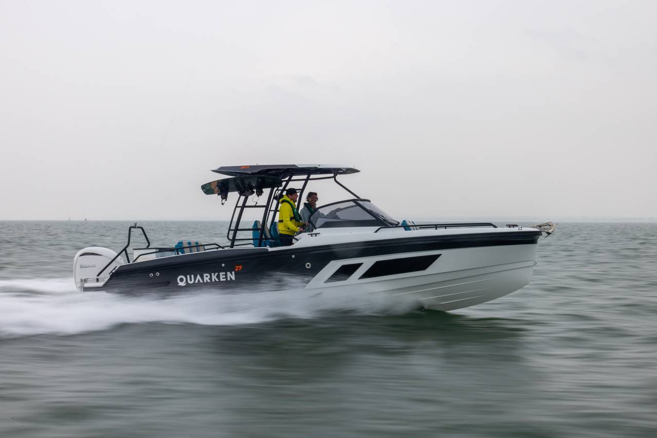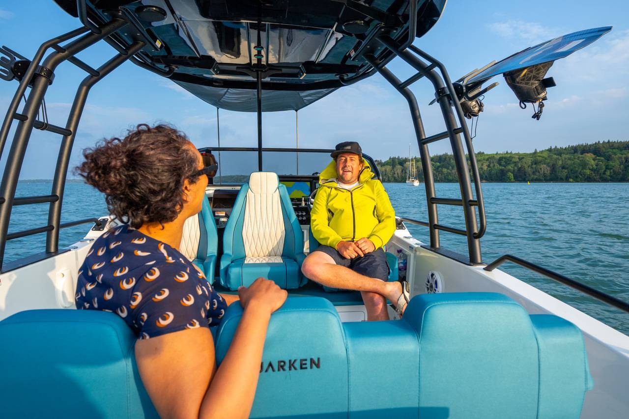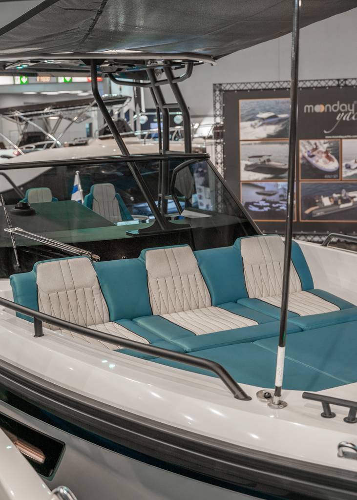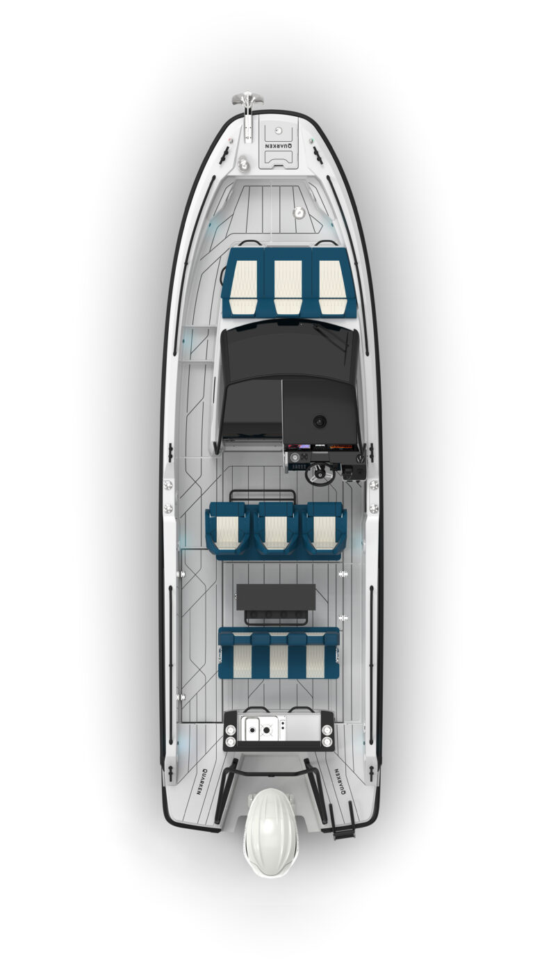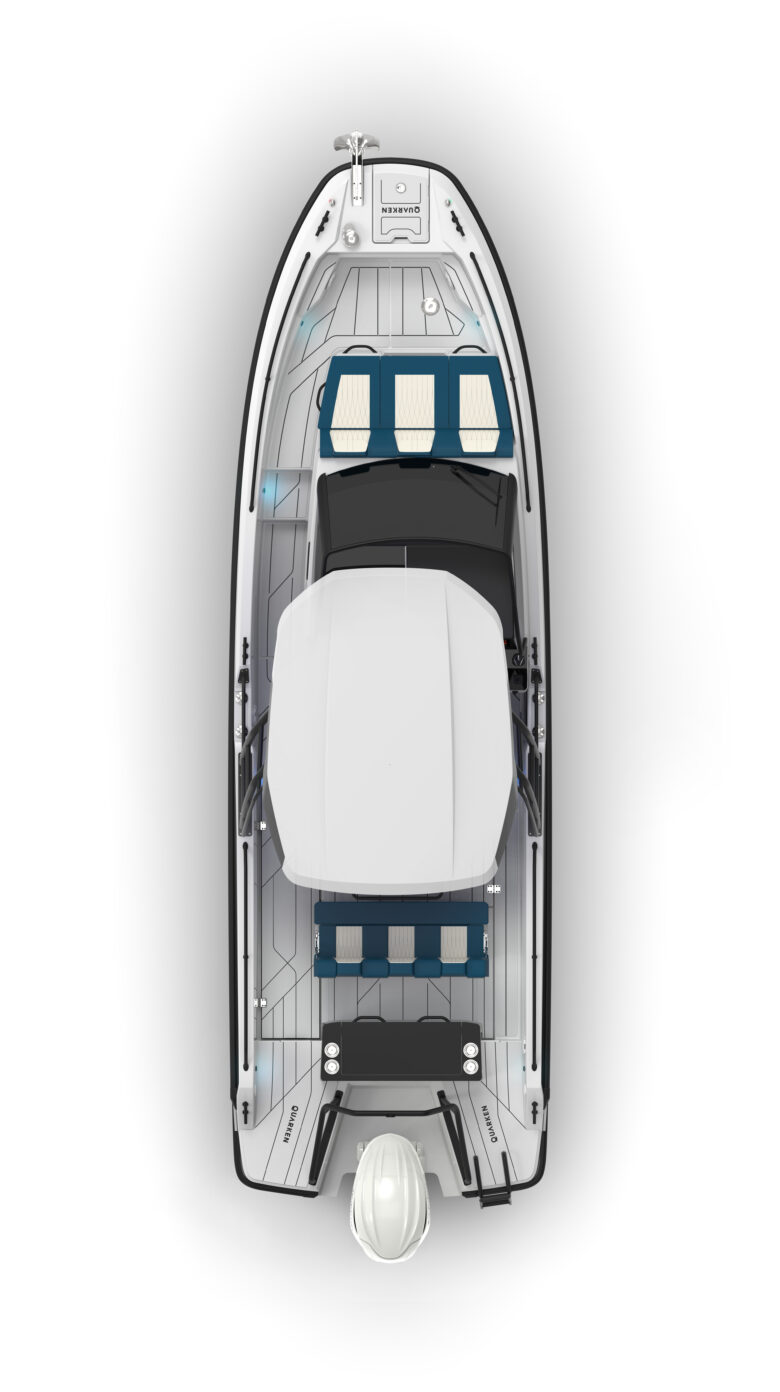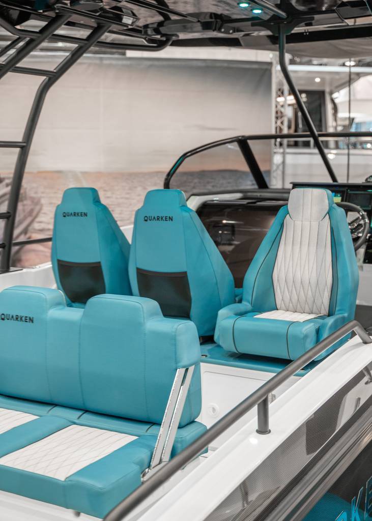 The boat comes standard with a foiled hull in an elegant carbon fibre color and pattern scheme combined with beautiful turquoise and white upholstery including elegant and subtle detailing for striking and sophisticated looks. All railings, water-ski pole, and the sturdy T-Top roof structure are black colored.