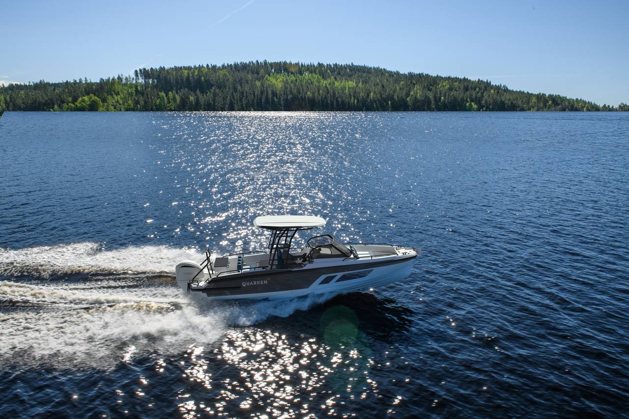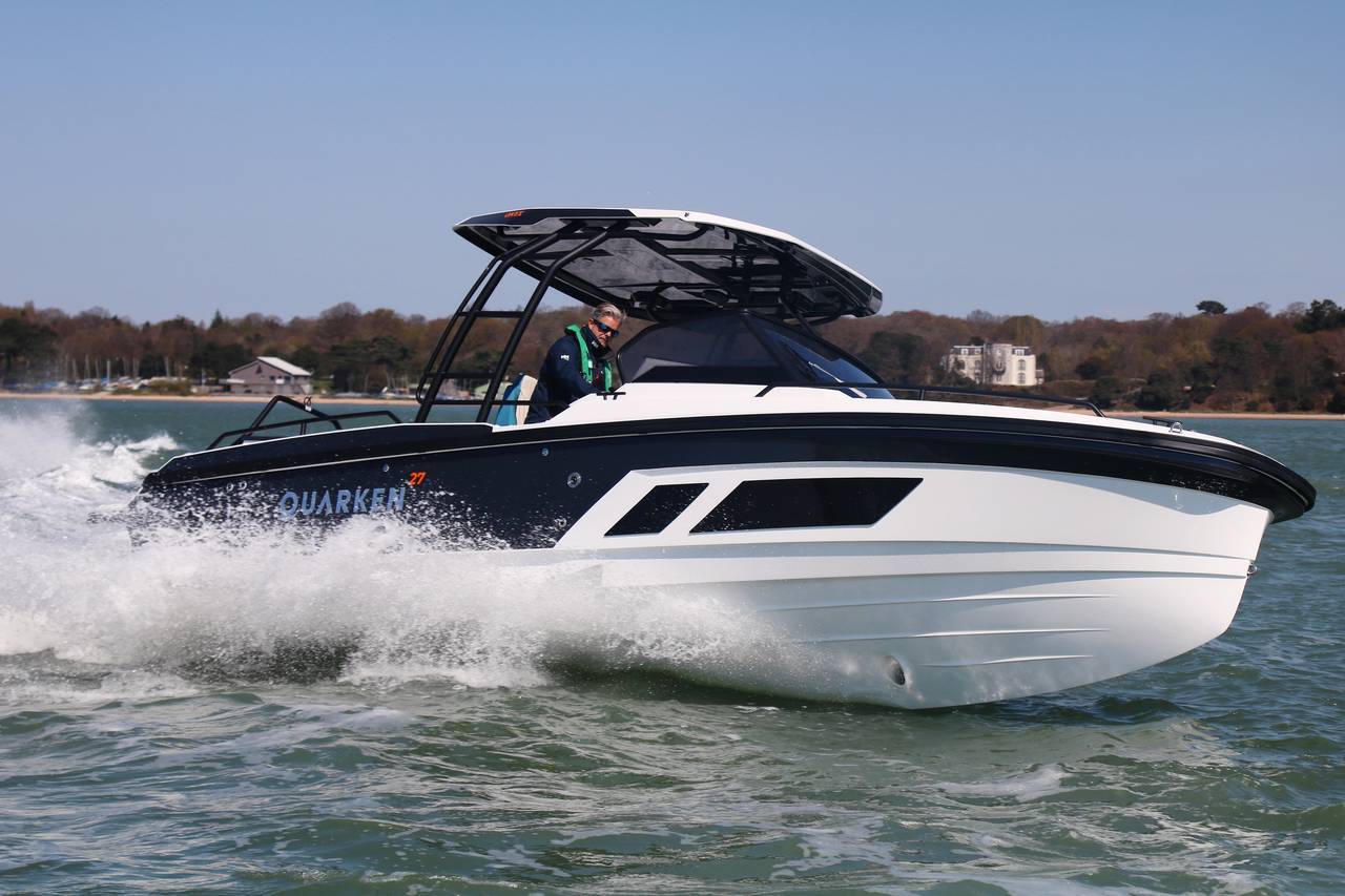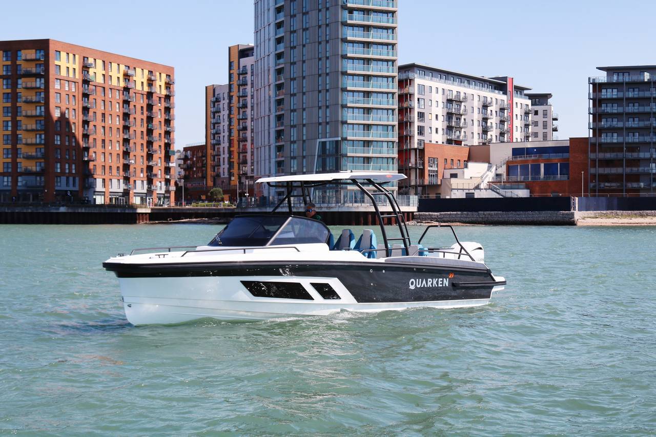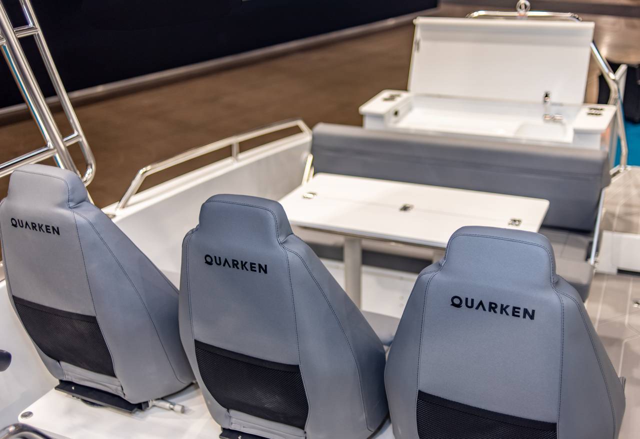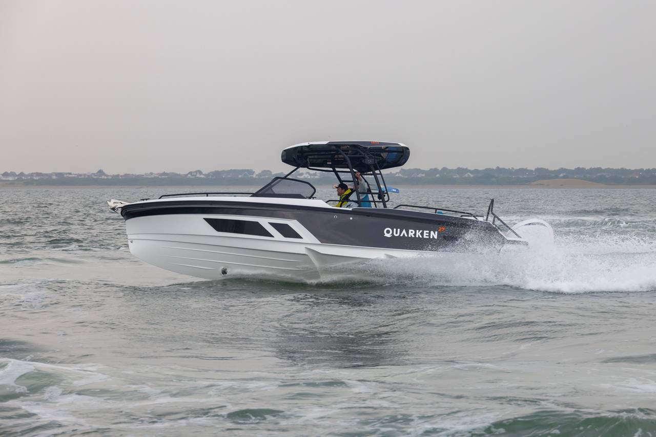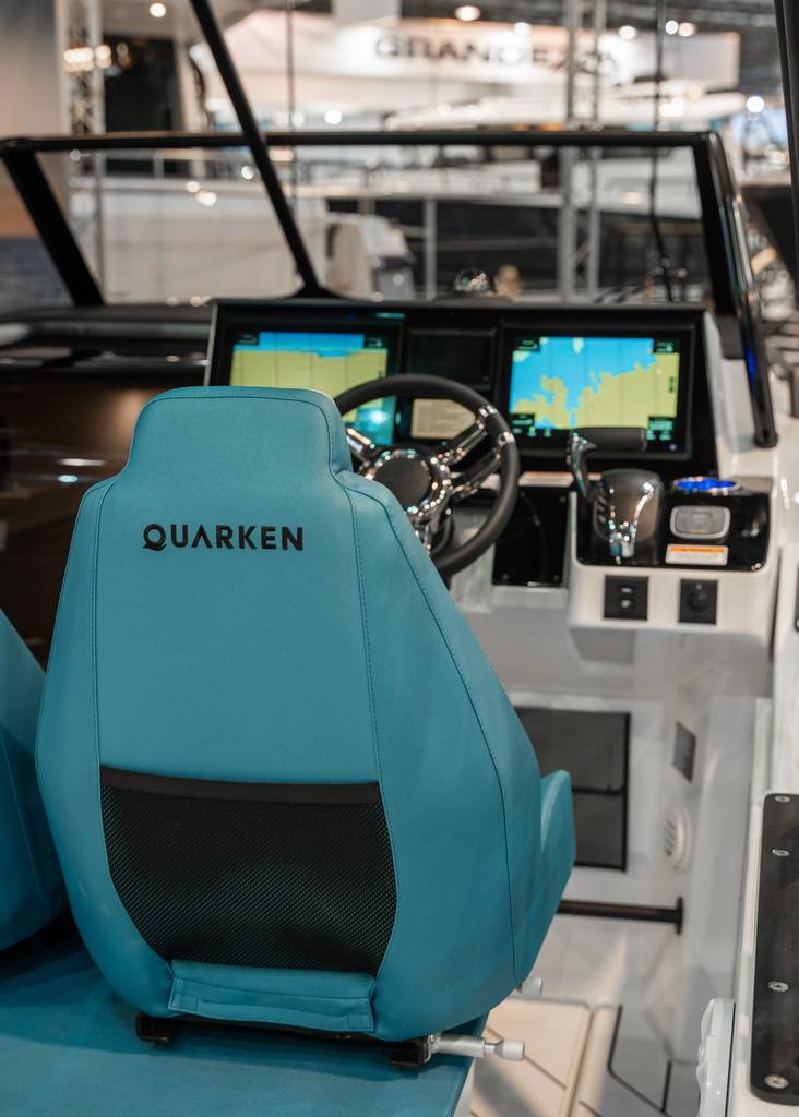 The boat comes standard with a foiled hull in an elegant carbon fibre color and pattern scheme combined with beautiful turquoise and white upholstery including elegant and subtle detailing for striking and sophisticated looks. All railings, water-ski pole, and the sturdy T-Top roof structure are black colored.