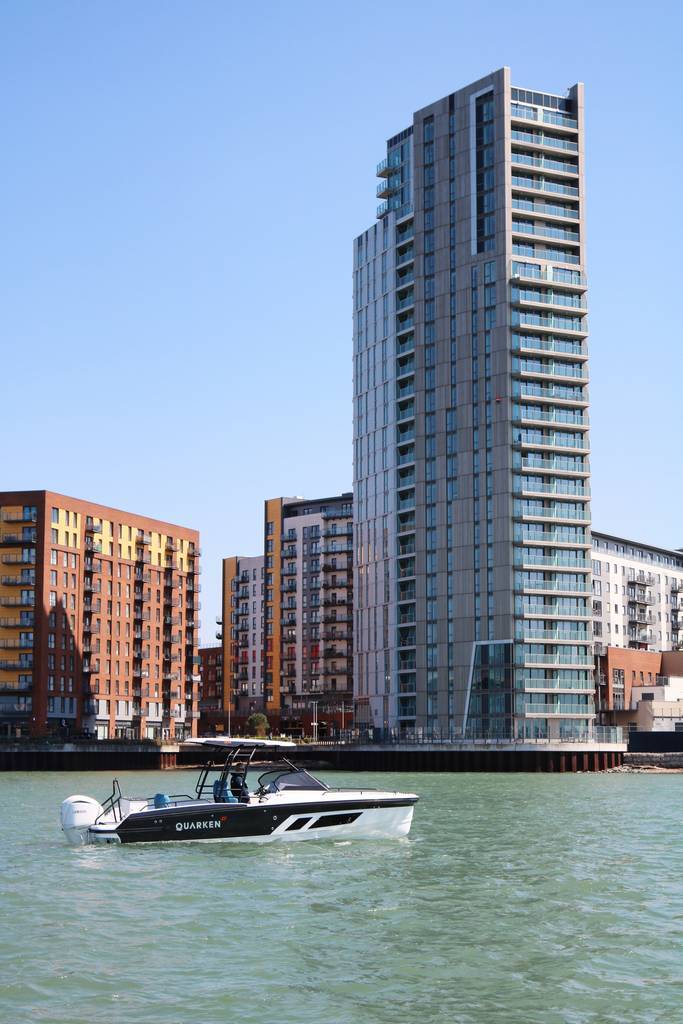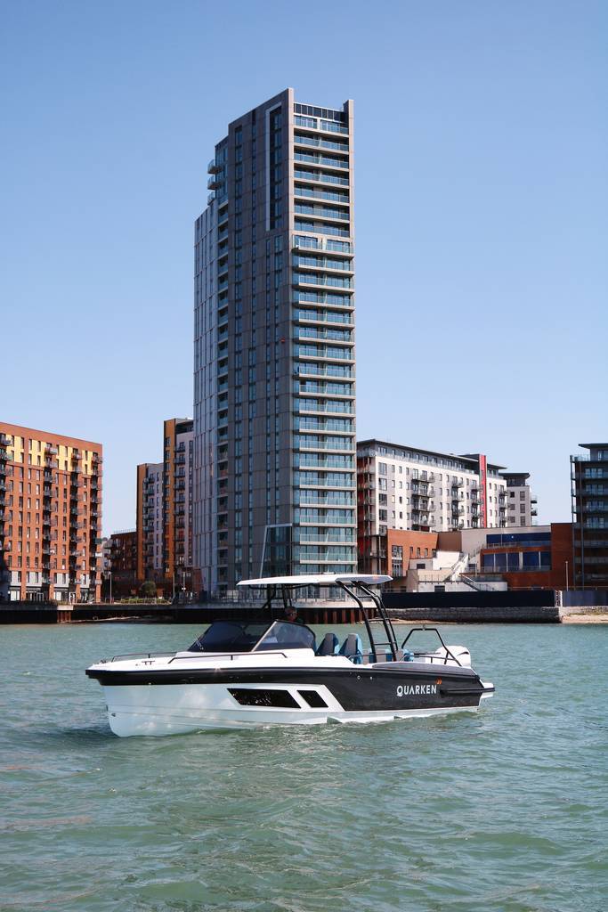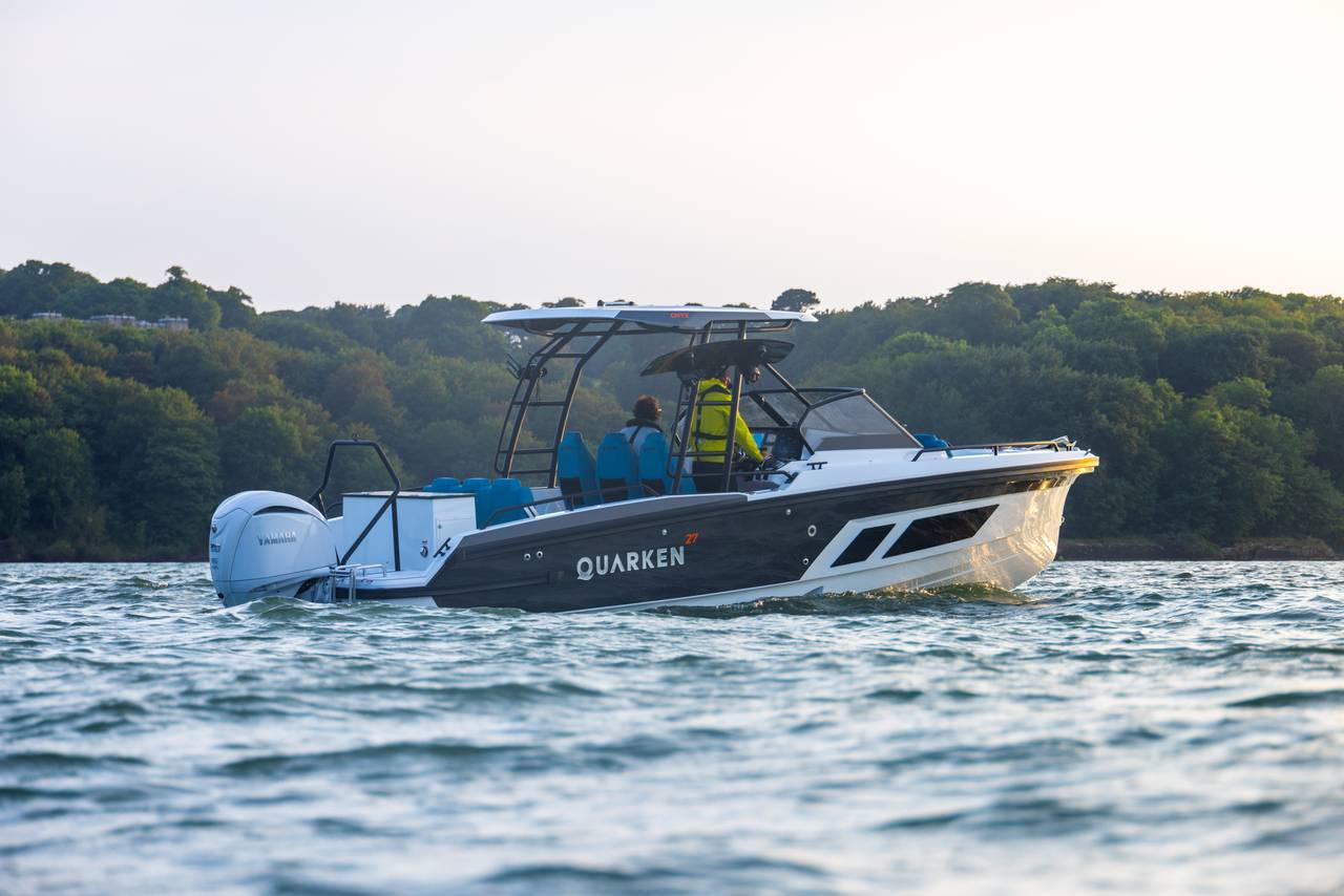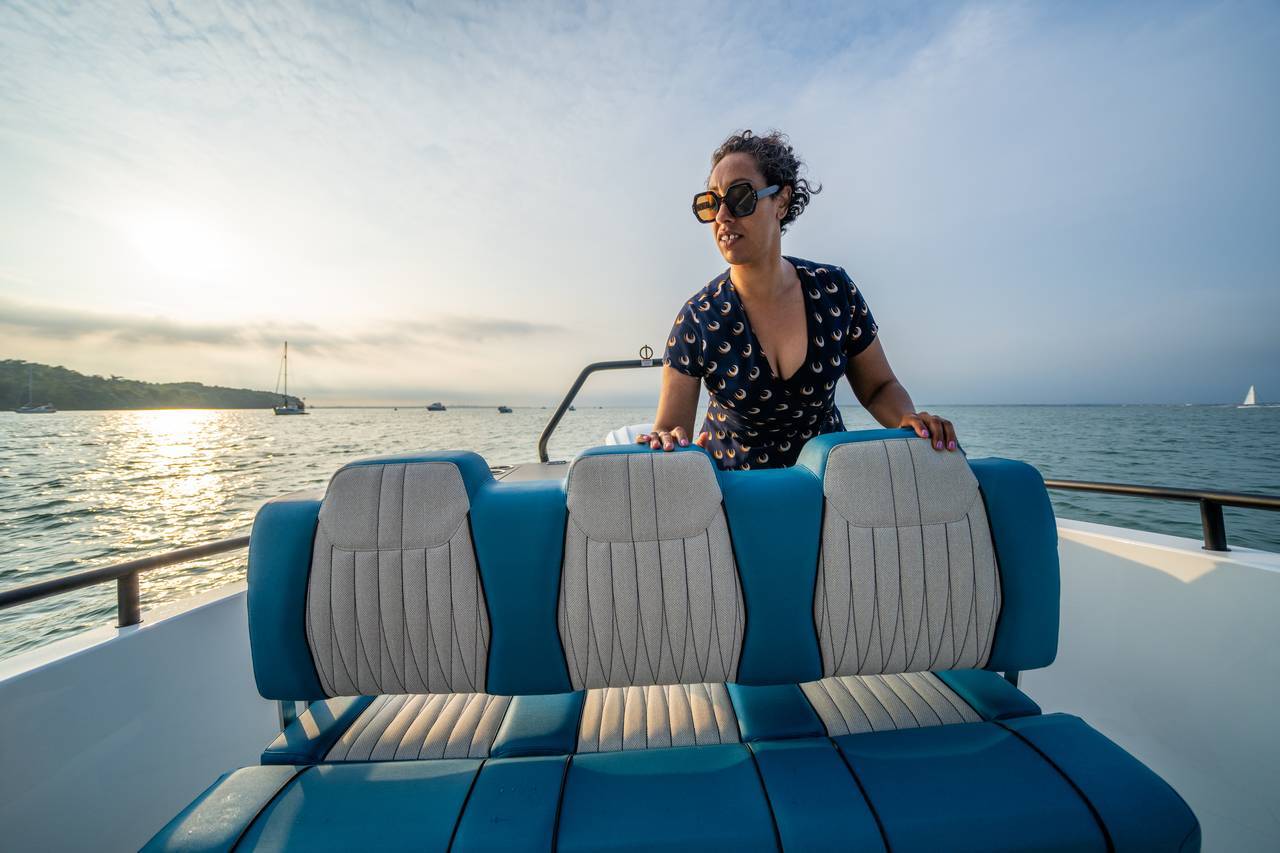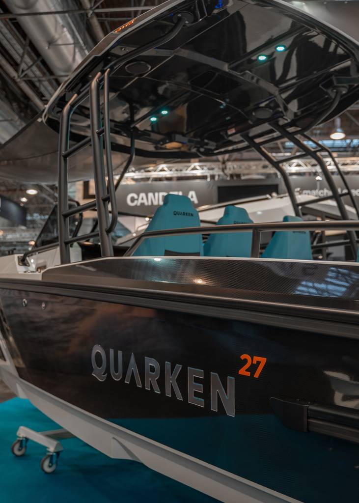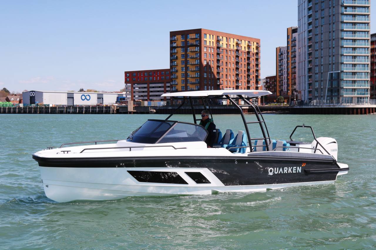 The boat comes standard with a foiled hull in an elegant carbon fibre color and pattern scheme combined with beautiful turquoise and white upholstery including elegant and subtle detailing for striking and sophisticated looks. All railings, water-ski pole, and the sturdy T-Top roof structure are black colored.