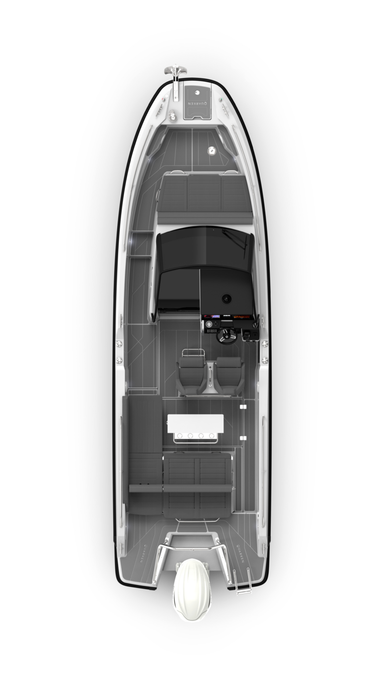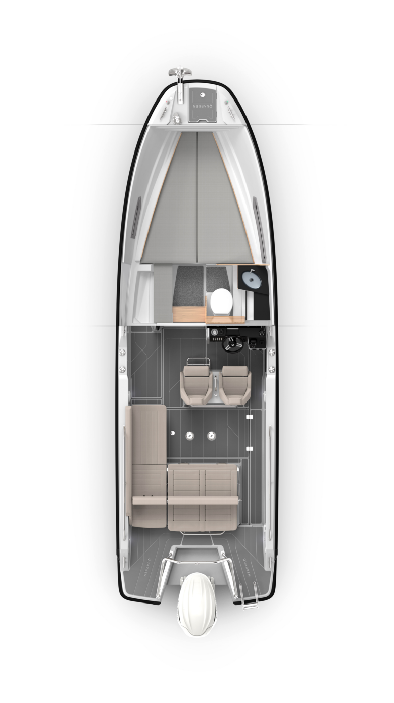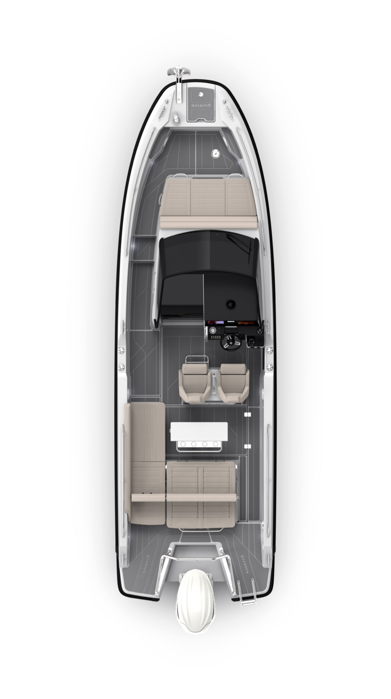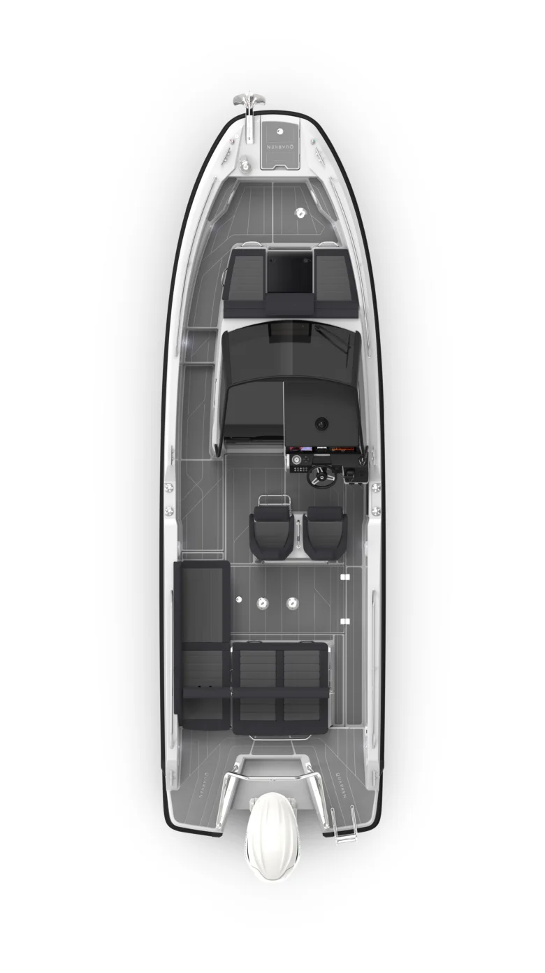 The layout comes with three rotating seats at the helm, a sofa with a sliding backrest and a wet bar unit. A suite of helpful features are standard such as twin Garmin 12” plotters, bow thruster and automatic trim tabs to guarantee the best possible driving and docking experience. In addition, important equipment such as shore power, electrical toilet, fresh water, transom shower and Smartdeck are standard for you to be able to enjoy the highest possible comfort onboard.