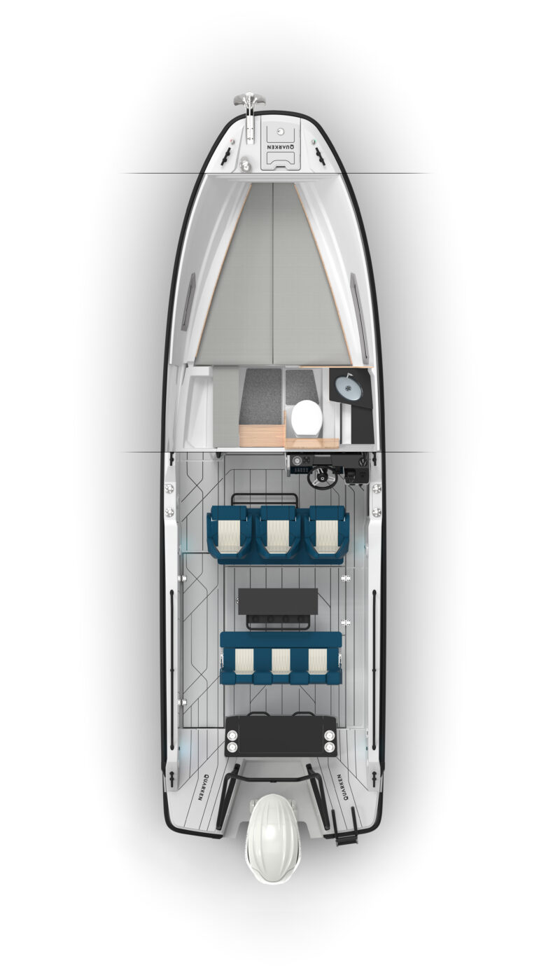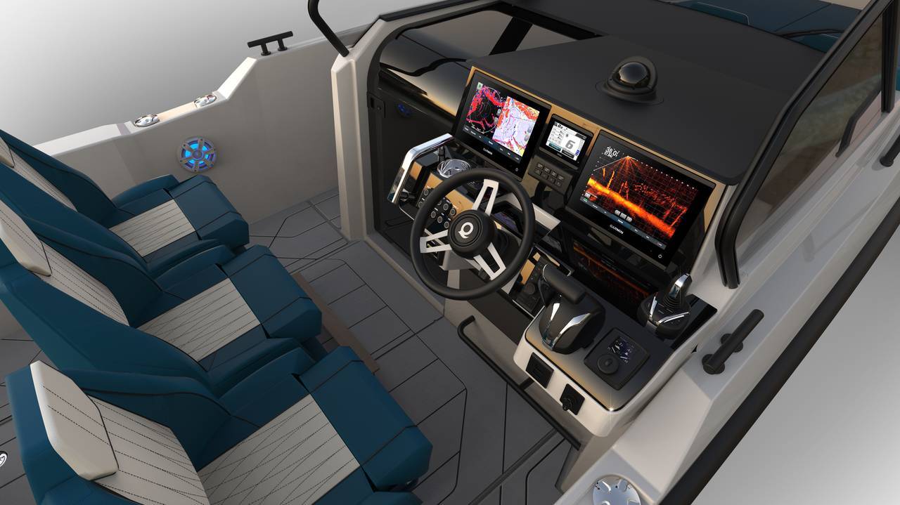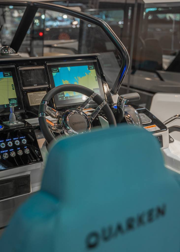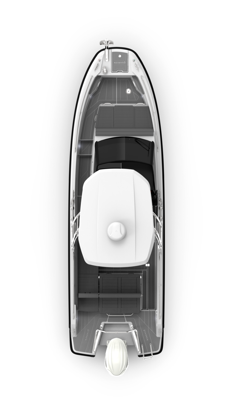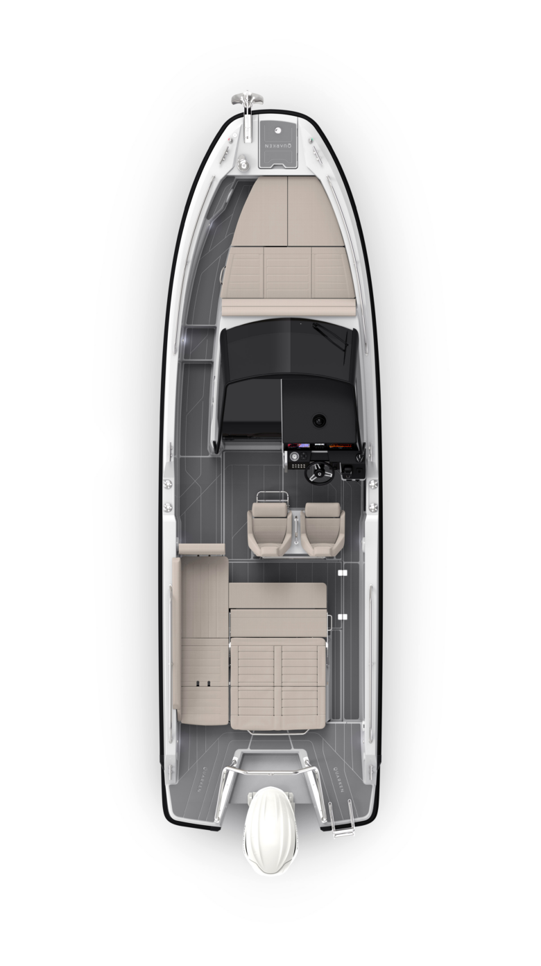 The layout comes with three rotating seats at the helm, a sofa with a sliding backrest and a wet bar unit. A suite of helpful features are standard such as twin Garmin 12” plotters, bow thruster and automatic trim tabs to guarantee the best possible driving and docking experience. In addition, important equipment such as shore power, electrical toilet, fresh water, transom shower and Smartdeck are standard for you to be able to enjoy the highest possible comfort onboard.