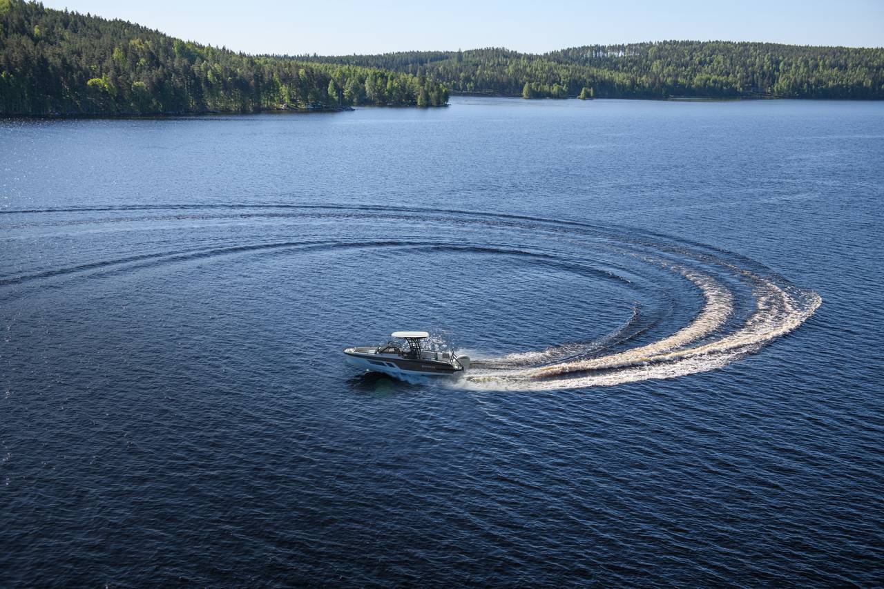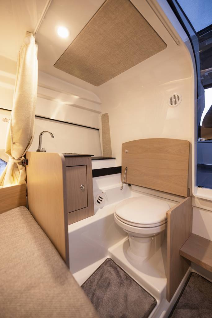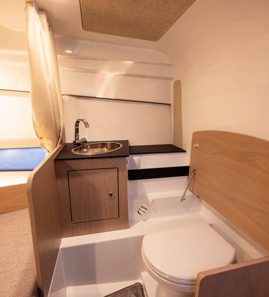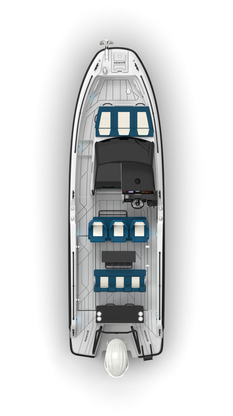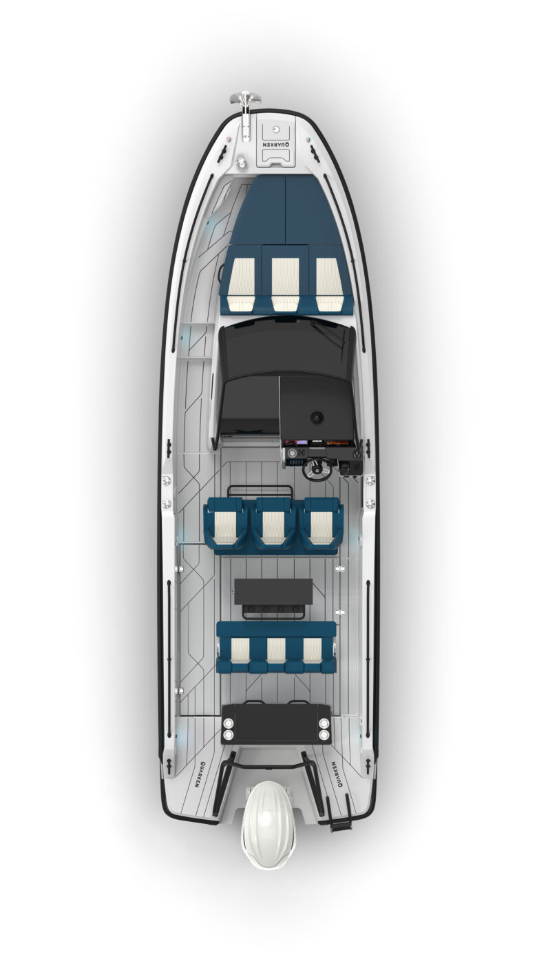 The layout comes with three rotating seats at the helm, a sofa with a sliding backrest and a wet bar unit. A suite of helpful features are standard such as twin Garmin 12” plotters, bow thruster and automatic trim tabs to guarantee the best possible driving and docking experience. In addition, important equipment such as shore power, electrical toilet, fresh water, transom shower and Smartdeck are standard for you to be able to enjoy the highest possible comfort onboard.