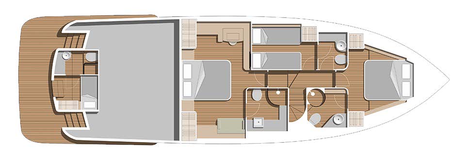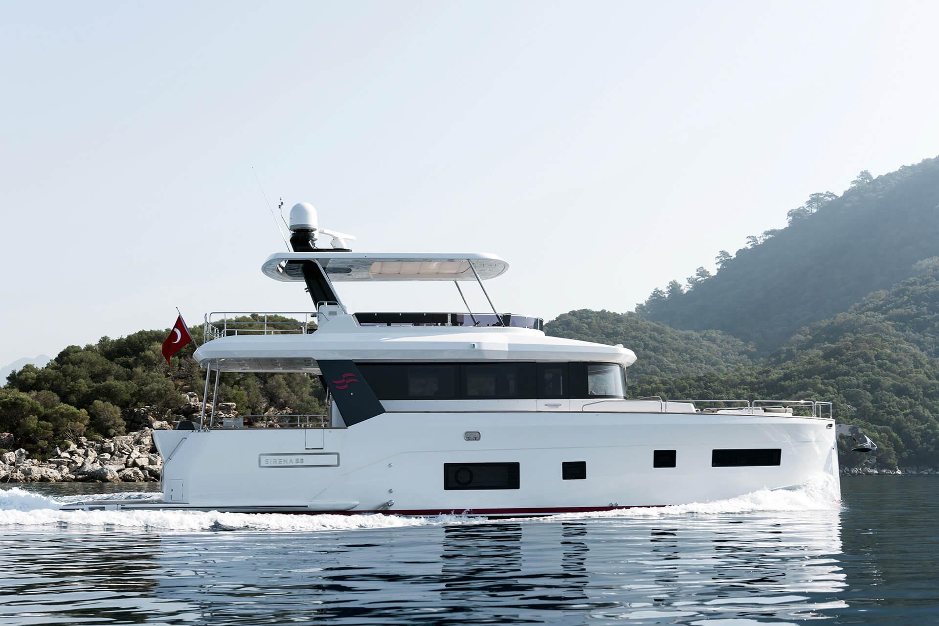 The Sirena 58 motor yacht, built in 2024, is on sale. The yacht is located in Croatia and is available for inspection by appointment. The Sirena 58 is distinguished by its efficient hull, which provides excellent performance in a wide range of modes, from displacement to gliding. It is capable of exploring the most remote corners of the world, offering comfort and safety with low fuel consumption. The interior of the yacht is quite spacious for its size. High-quality wood and fabric finishes provide various interior layout options, allowing everyone to enjoy life at sea to their liking. Sirena 58 is a unique yacht with many additional options and plenty of space for everyone. Through the large sliding glass doors at the rear you enter the modern kitchen. From the kitchen you pass into the spacious salon and the wheelhouse, which are combined on one level in an open floor plan with a large volume and 360–degree panoramic views. Large windows around the perimeter of the cabin provide a magnificent view and fill the space with light. The entire yacht has high ceilings and ample volume on both decks. Spacious and well—designed squares are one of the unique features of Sirena. There are three cabins on the lower deck: a master cabin, a VIP cabin and a guest cabin, with a total of six spacious berths. All cabins have an individual layout, a high level of comfort and private bathrooms with a shower. There is plenty of space on the flybridge for privacy and socializing: there is a sofa, sun beds and a teak deck. The view from the flybridge is magnificent, and the captain can easily steer the boat with a perfect view. An additional refrigerator and grill allow you to cook outdoors. There is a large sunbed on the bow of the yacht, on which you can lift the backs, thus creating an ideal place for sunbathing. There is a combined washing machine and dryer in the stern of the yacht. This space, used as a warehouse, can be converted into an additional cabin. There is an ascending and descending bathing ramp in the cockpit, a popular bathing spot for both children and adults. An inflatable boat or a jet ski can also be placed on the stern.